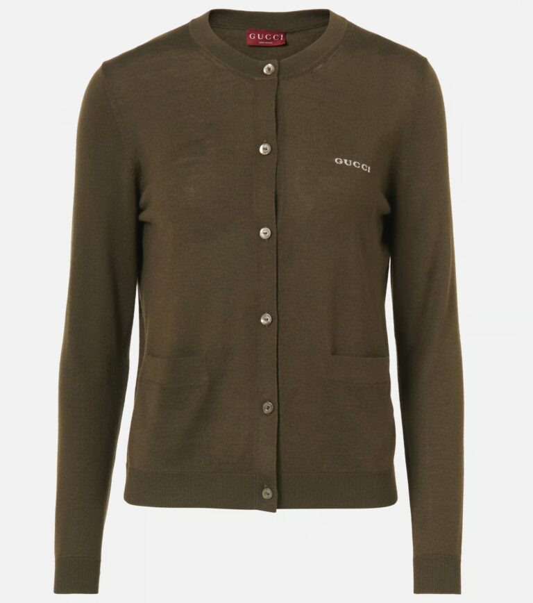 Cashmere/silk blend provides Military/White shade with button-down closure. Dry-clean-only care preserves luxurious professional texture.