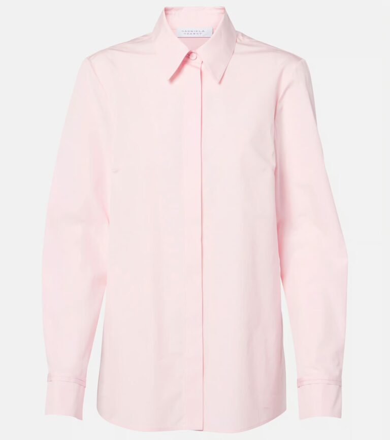 Cotton top features Pale Blush shade with concealed button placket. Polo collar adds professional structure.