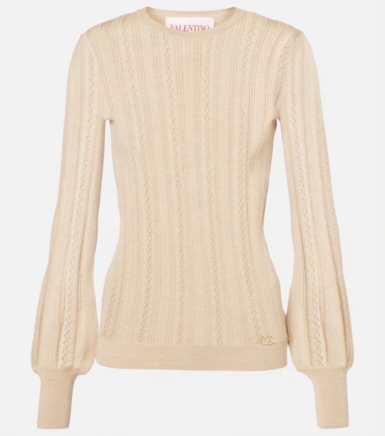 Virgin wool knit features Beige shade for versatile office layering. Hand wash only care maintains professional softness.