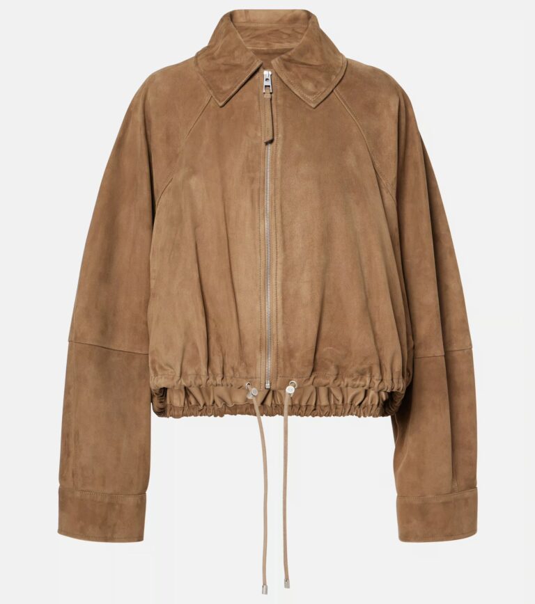 Leather jacket offers Khaki Green shade with zipped front for security. Drawstring and side slit pockets enhance professional utility.